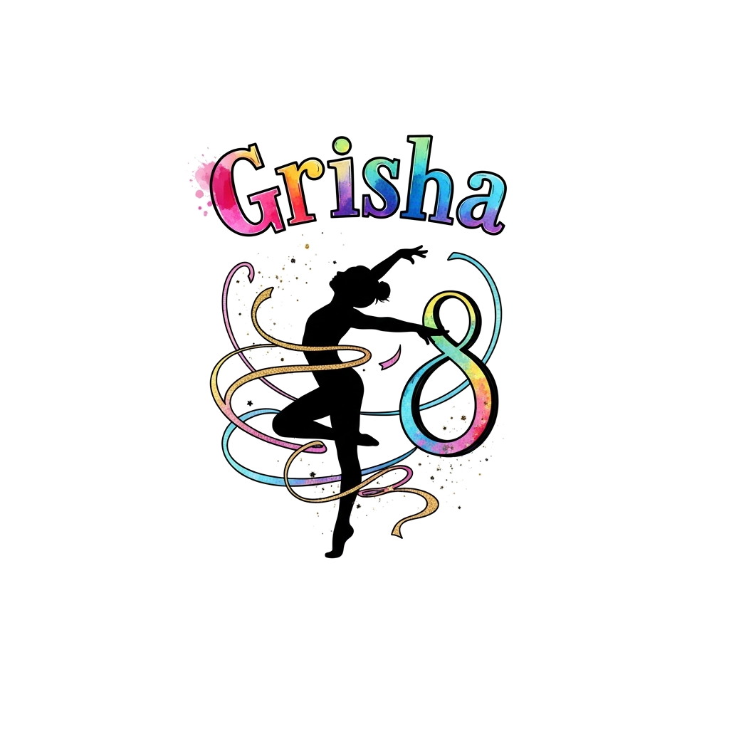 "A graceful silhouette of a young gymnast performing a dynamic pose, surrounded by swirling ribbons and glitter, with the number '8' subtly integrated into the design, in a vibrant watercolor and ink style, text 'Grisha' above."