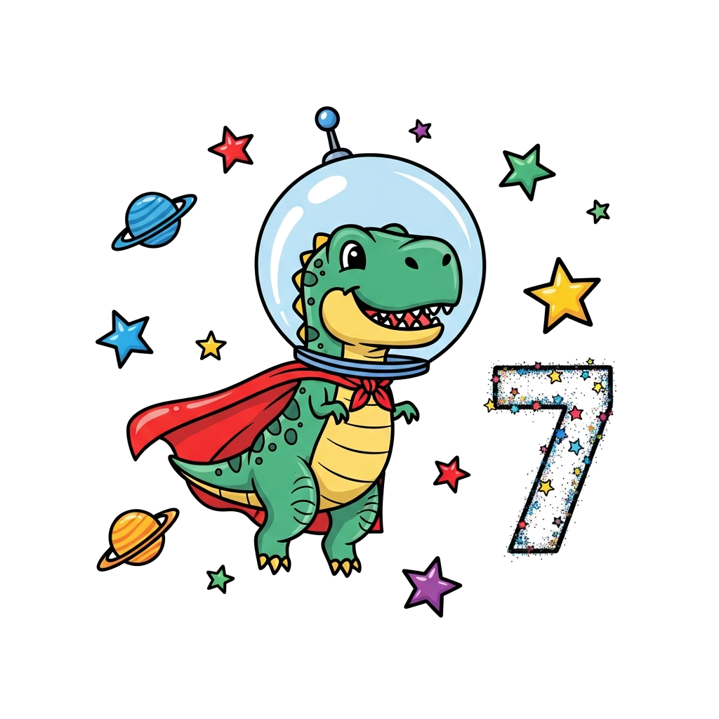 "A cute cartoon T-Rex wearing a superhero cape and astronaut helmet, floating happily in space surrounded by stars, planets, and a '7' made of stardust, in a playful and vibrant style."