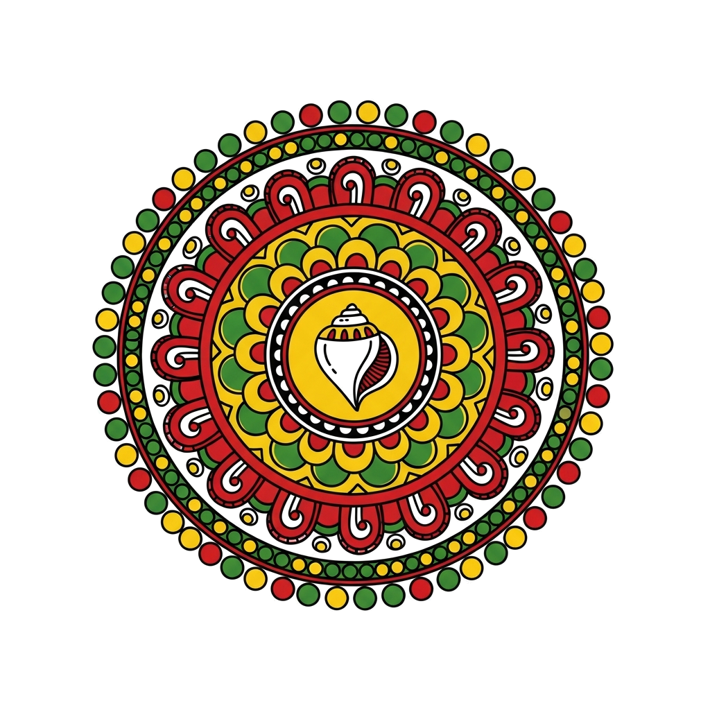 "A vibrant, intricate circular Alpana design in traditional Bengali colors (red, white, yellow, green), with a stylized conch shell at its center. Surrounded by small, playful dots and swirls, in a folk art style, perfect for a child."