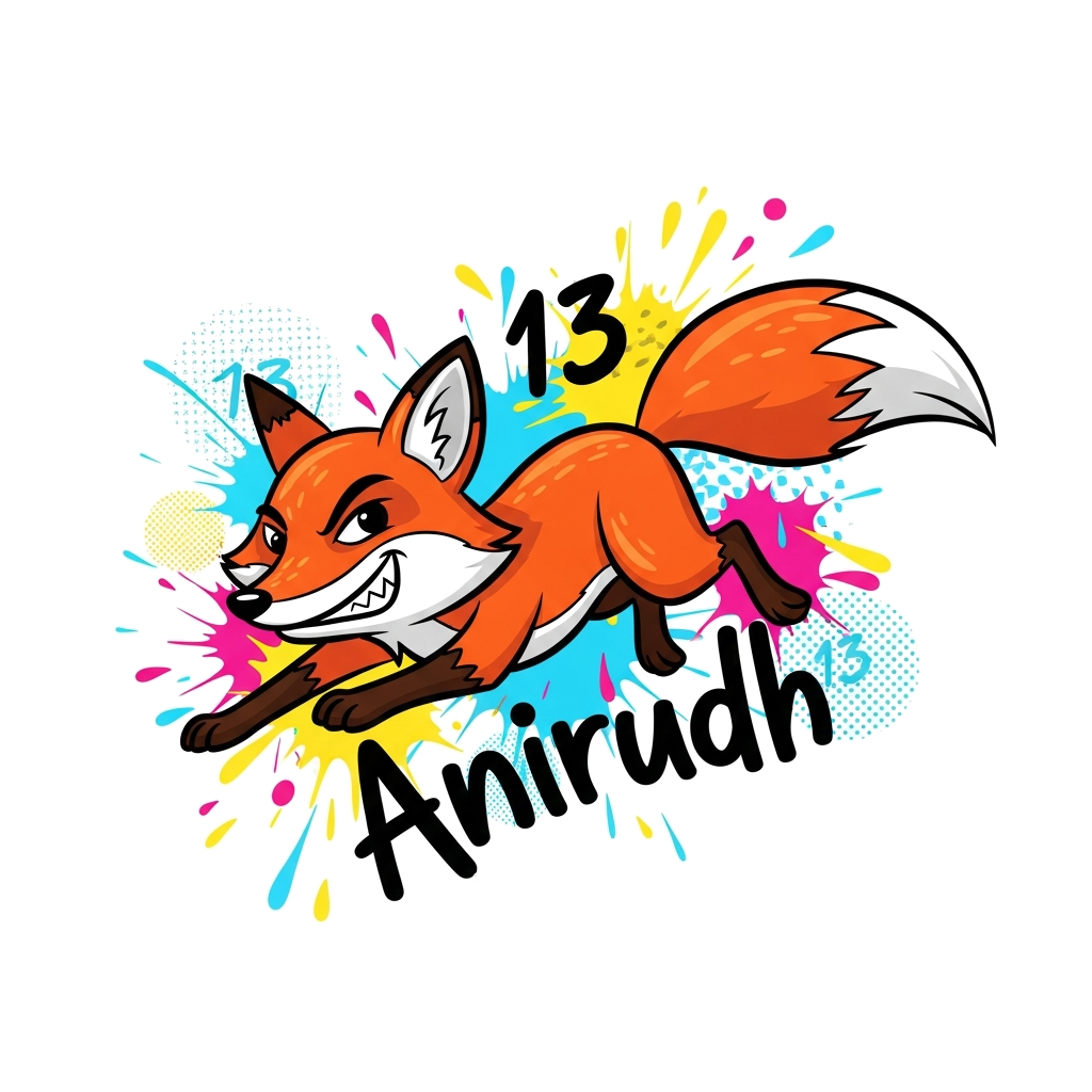 "A sleek, intelligent cartoon fox with a mischievous grin, mid-action pounce, surrounded by abstract, spontaneous bursts of bright, energetic colors and subtle geometric patterns. The number '13' is cleverly integrated into the design elements, and 'Anirudh' is written in a modern, dynamic script. Digital illustration, vibrant and engaging."