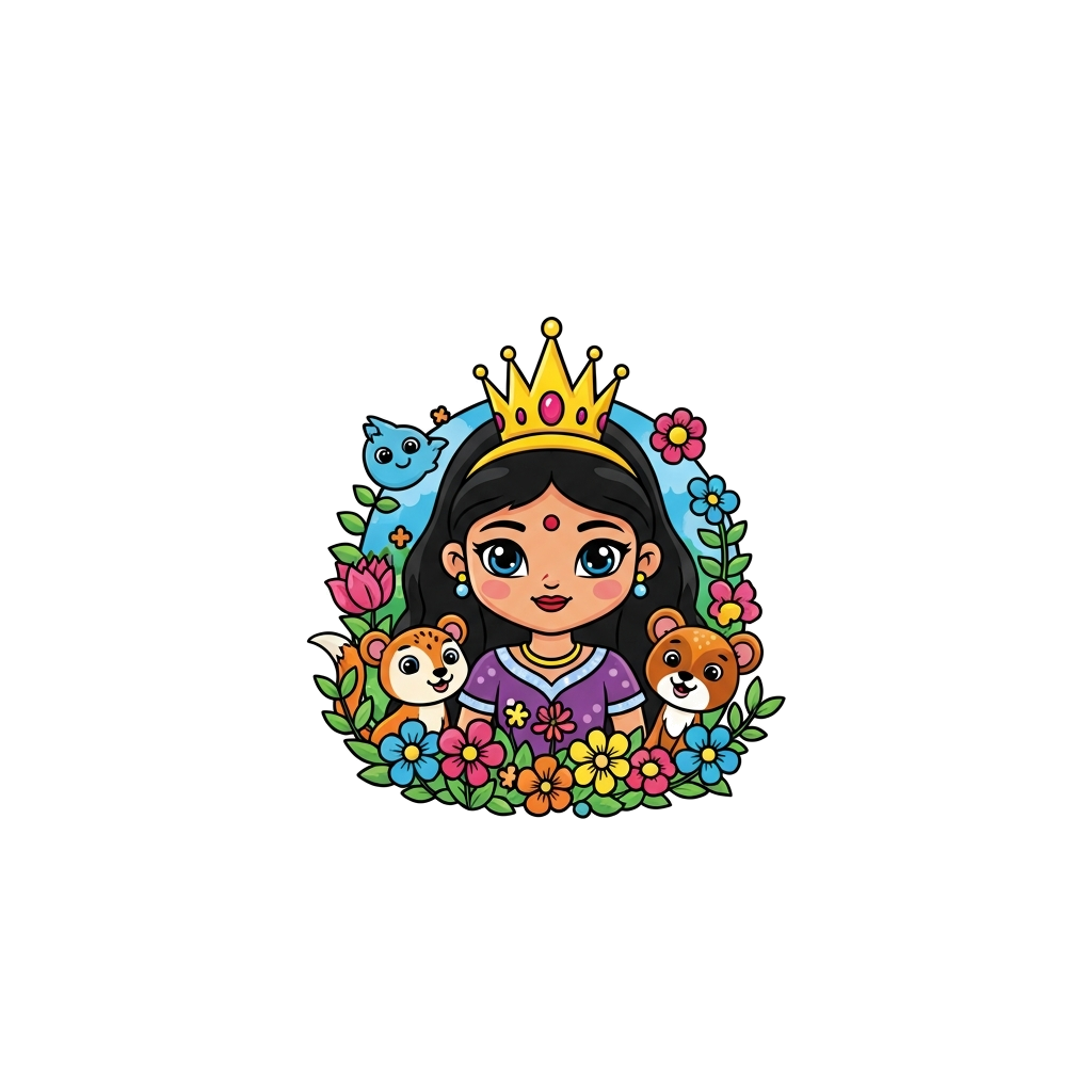 "A cute cartoon princess Dinushriya with a sparkling crown, surrounded by friendly forest animals and colorful flowers, whimsical and cheerful style."