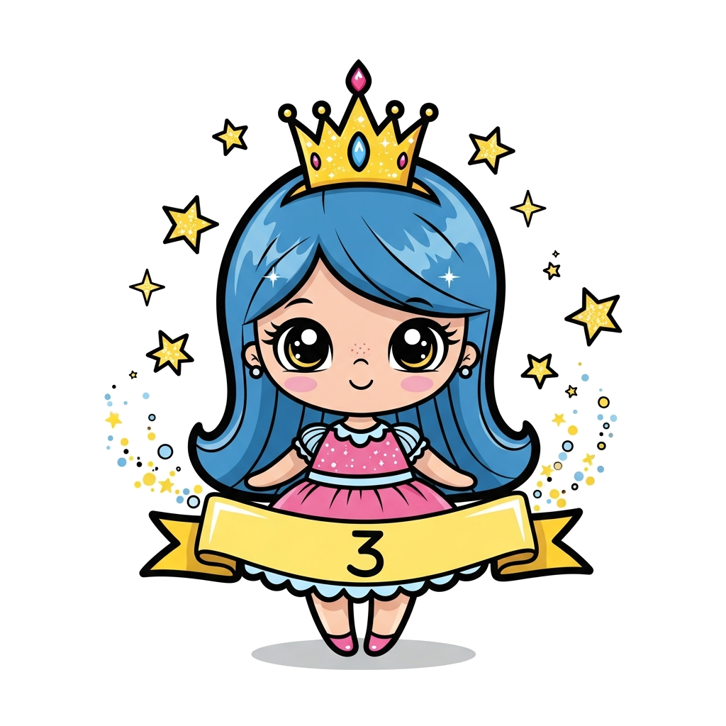 "A whimsical illustration of a cute cartoon princess with a sparkling crown, surrounded by glittery stars and magical dust, with the number '3' subtly incorporated into a royal banner, vibrant and child-friendly style."