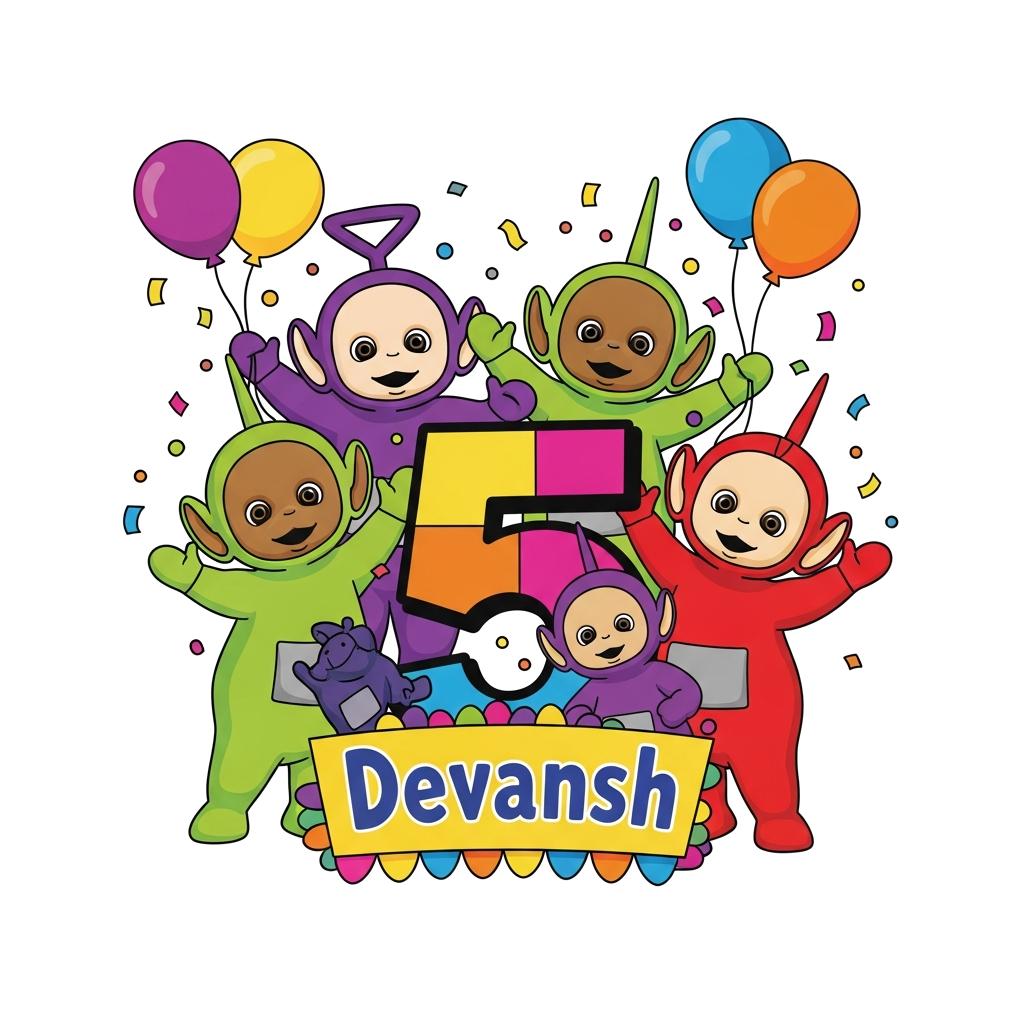 "A vibrant cartoon illustration featuring all four Teletubbies (Tinky Winky, Dipsy, Laa-Laa, Po) joyfully celebrating around a large, colorful number '5', with balloons and confetti, and the name 'Devansh' playfully integrated."