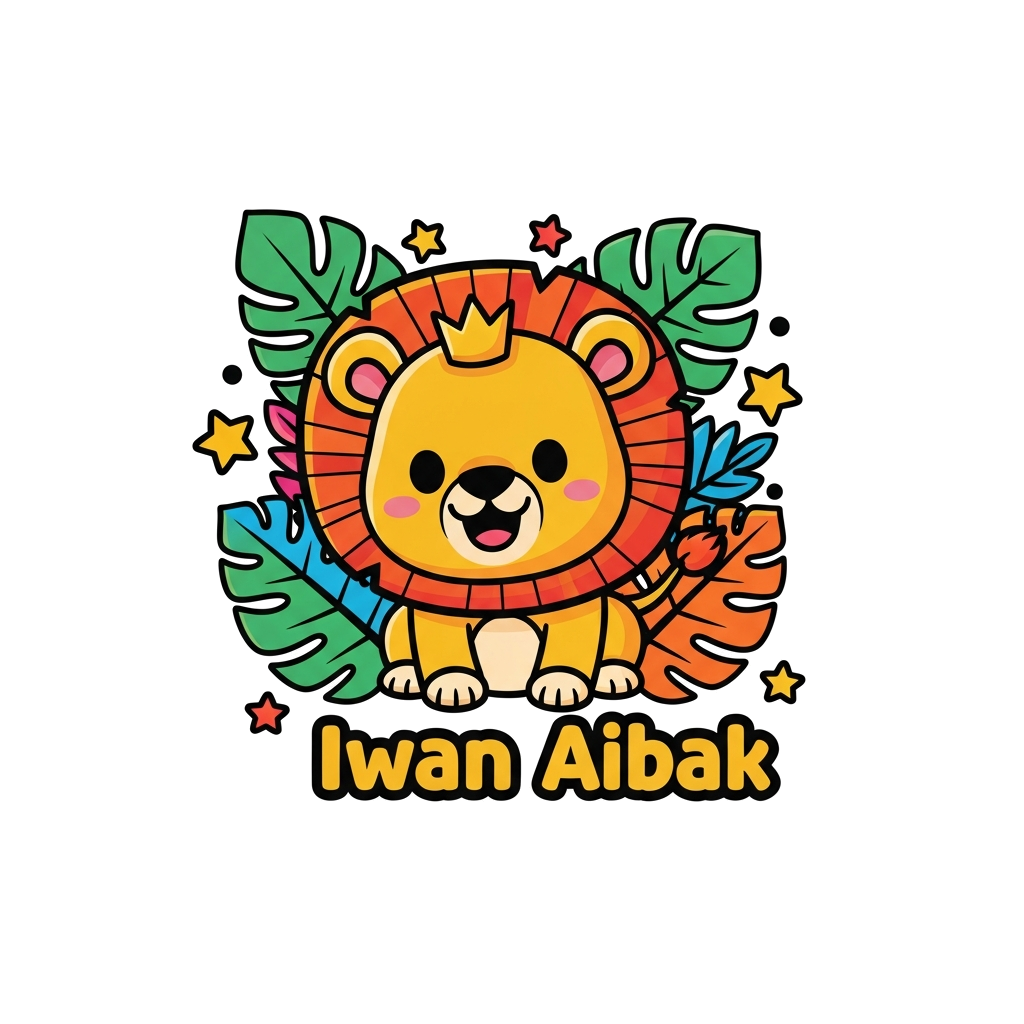 "A vibrant cartoon illustration of a happy baby lion cub with a tiny crown, surrounded by bold, colorful jungle leaves and stars, text 'Iwan Aibak' in a playful font, bright and cheerful style."