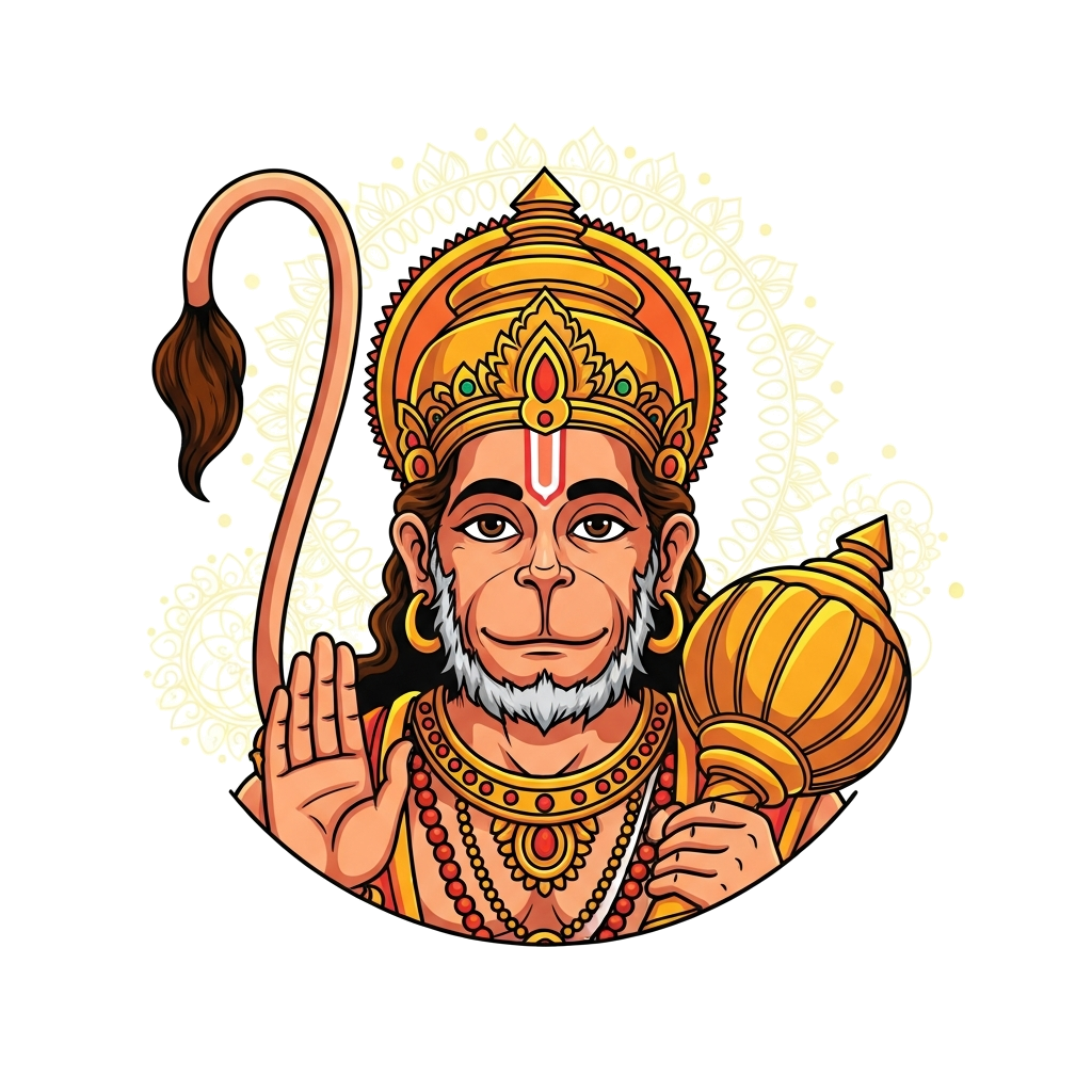 "A stylized and spiritual depiction of Lord Hanuman, focusing on his face and powerful form, in a traditional Indian art style. The design uses bold lines and a rich palette of orange, saffron, and deep red, conveying strength and devotion with intricate, ornamental details."
