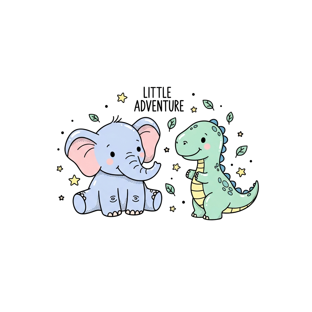 "A soft pastel illustration of a baby elephant and a friendly baby dinosaur, both in a delicate hand-drawn doodle style, surrounded by tiny stars and leaves. The phrase 'Little Adventure' is subtly integrated into the design, all in a gender-neutral color palette."