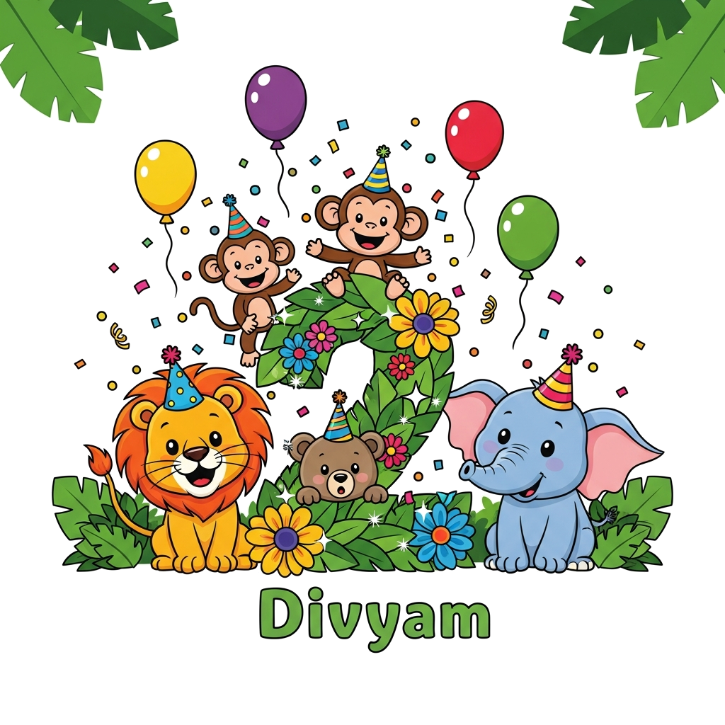 "A vibrant cartoon illustration of a grand birthday celebration in a lush jungle. A happy baby lion, a playful monkey, a cheerful baby elephant, and a cute baby bear are all wearing tiny party hats. They are surrounded by a flurry of colorful confetti and floating balloons. At the center is a prominent number '2' crafted from stylized leaves and bright flowers with sparkling accents, and the name 'Divyam' playfully written below it. The baby bear peeks out with curiosity from behind the '2', all set against a simplified, joyful jungle backdrop."