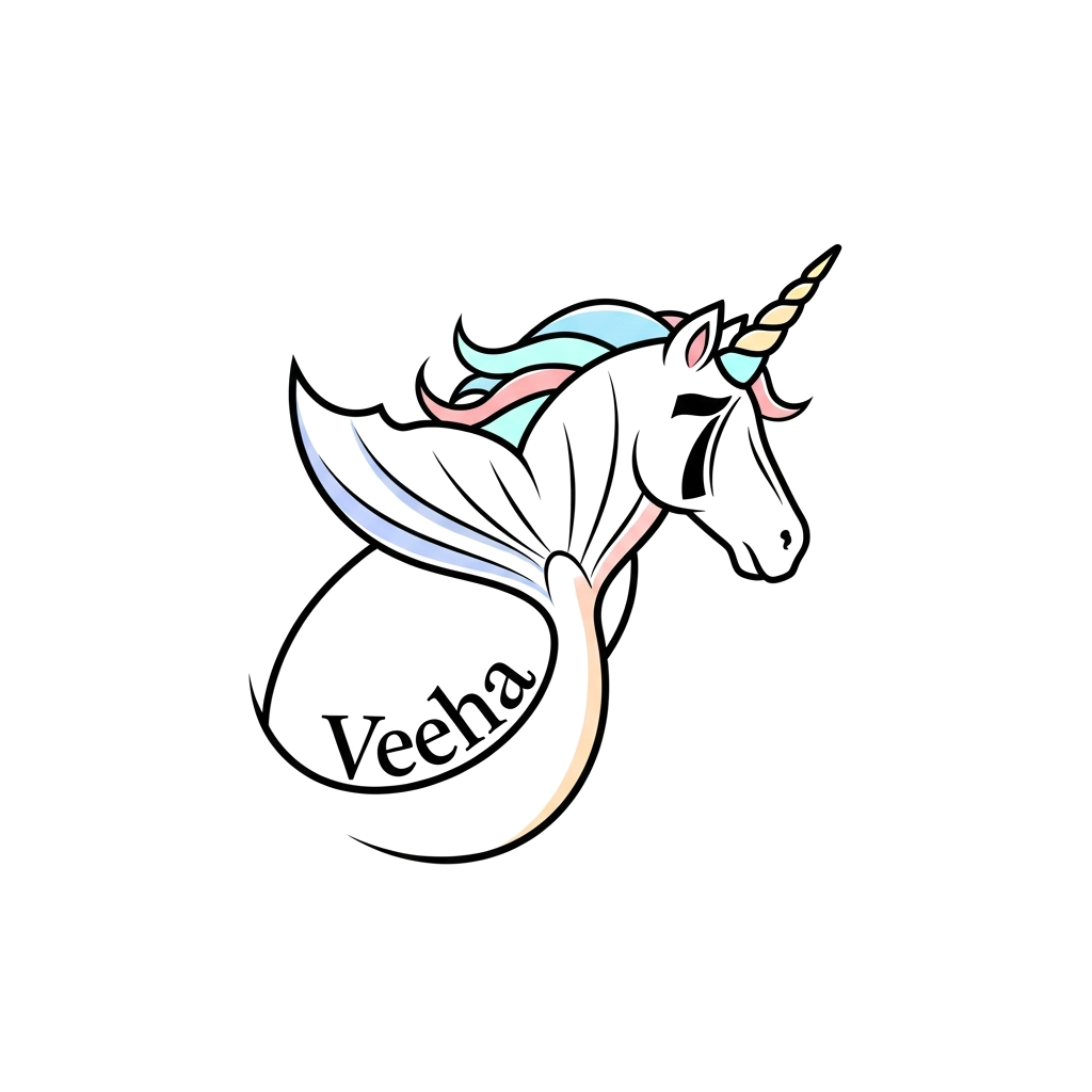 "A minimalist illustration featuring a graceful, stylized mermaid tail elegantly merging with a whimsical unicorn horn, rendered in clean lines and soft pastel colors. The name 'Veeha' and the number '7' are subtly integrated within the design, creating a modern and serene graphic."