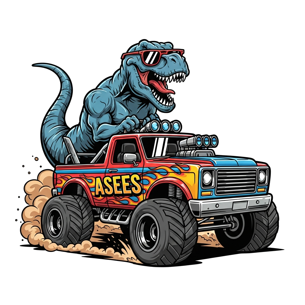 "A powerful, stylized T-Rex wearing cool sunglasses, confidently driving a custom-built, vibrant monster truck through a dusty desert. The truck has bold flames and the name 'Asees' integrated into the design. Dynamic, cool cartoon style with strong lines and bright, contrasting colors."