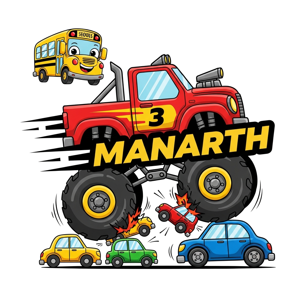 "A vibrant cartoon illustration of a powerful red monster truck with number '3' prominently displayed, crushing small, colorful toy cars. The name 'Manarth' is integrated boldly into the scene with speed lines. Surrounding the monster truck are various other cute cartoon vehicles like a yellow school bus and a blue sedan, all with a slightly edgy, fun style and bright primary colors."