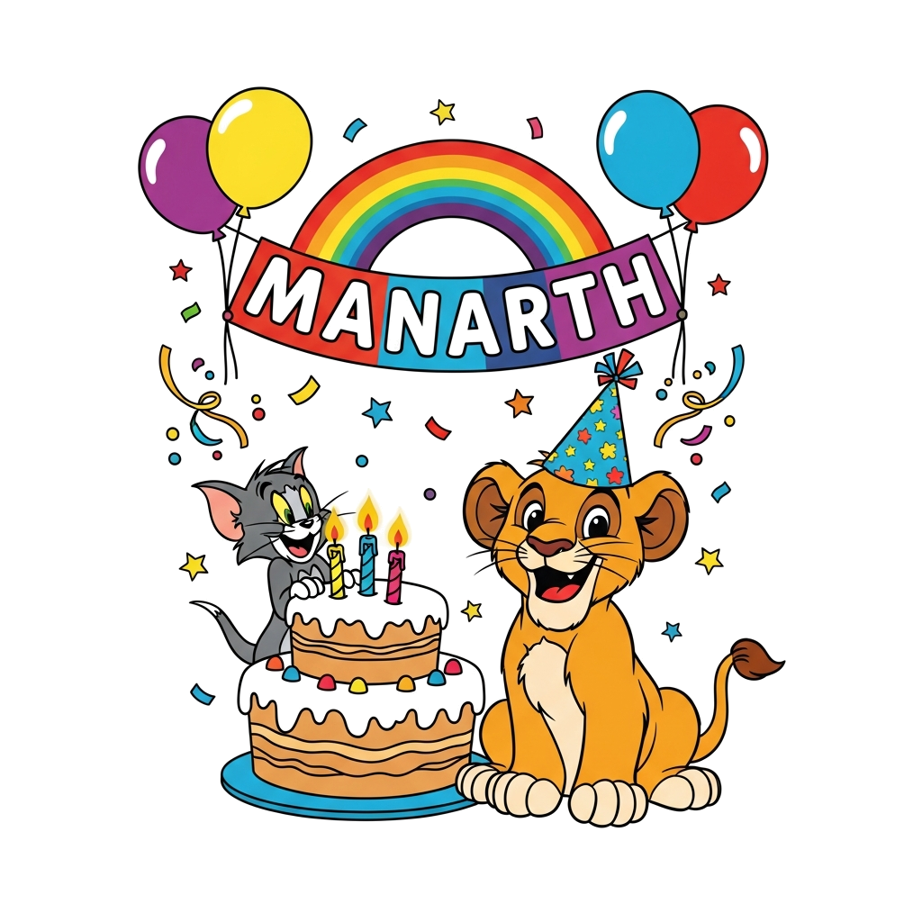 "A bright and happy cartoon illustration of a joyful lion cub, wearing a sparkly party hat, sitting proudly next to a towering birthday cake with 3 glowing candles. In a fun twist, Tom and Jerry are having a playful chase around the cake's base. 'Manarth' is written in playful, bold letters across a vibrant rainbow banner held by two cheerful balloons. Confetti and stars twinkle around them."