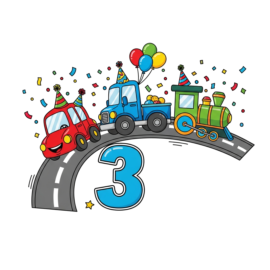 "A cute cartoon birthday parade featuring a happy red car, a blue truck, and a green train, all adorned with party hats and balloons, driving along a road with the number '3' prominently displayed, surrounded by colorful confetti and a bright, joyful atmosphere, in a vibrant, playful style."
