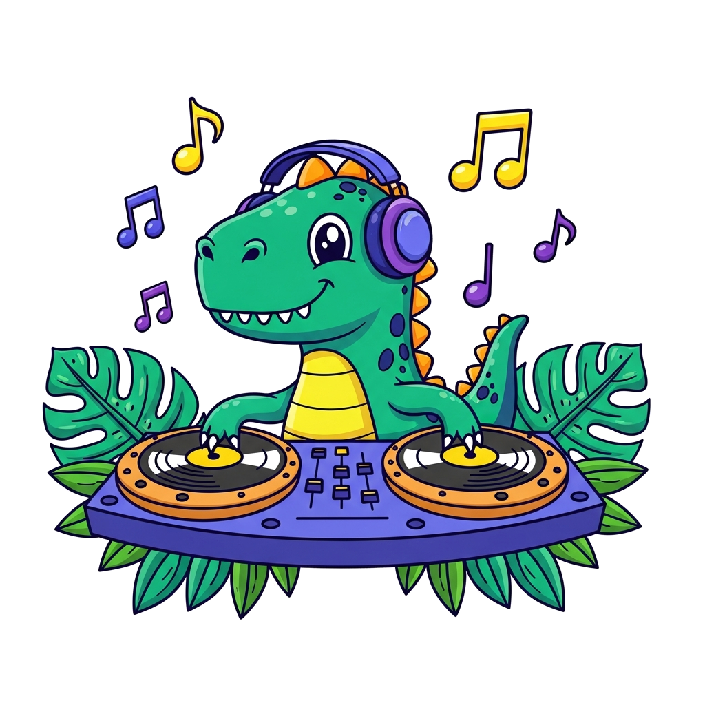 "A super cute cartoon dinosaur DJ, wearing headphones, spinning records made of giant cookies, surrounded by playful musical notes and lush green jungle leaves, in vibrant green, blue, and purple tones."