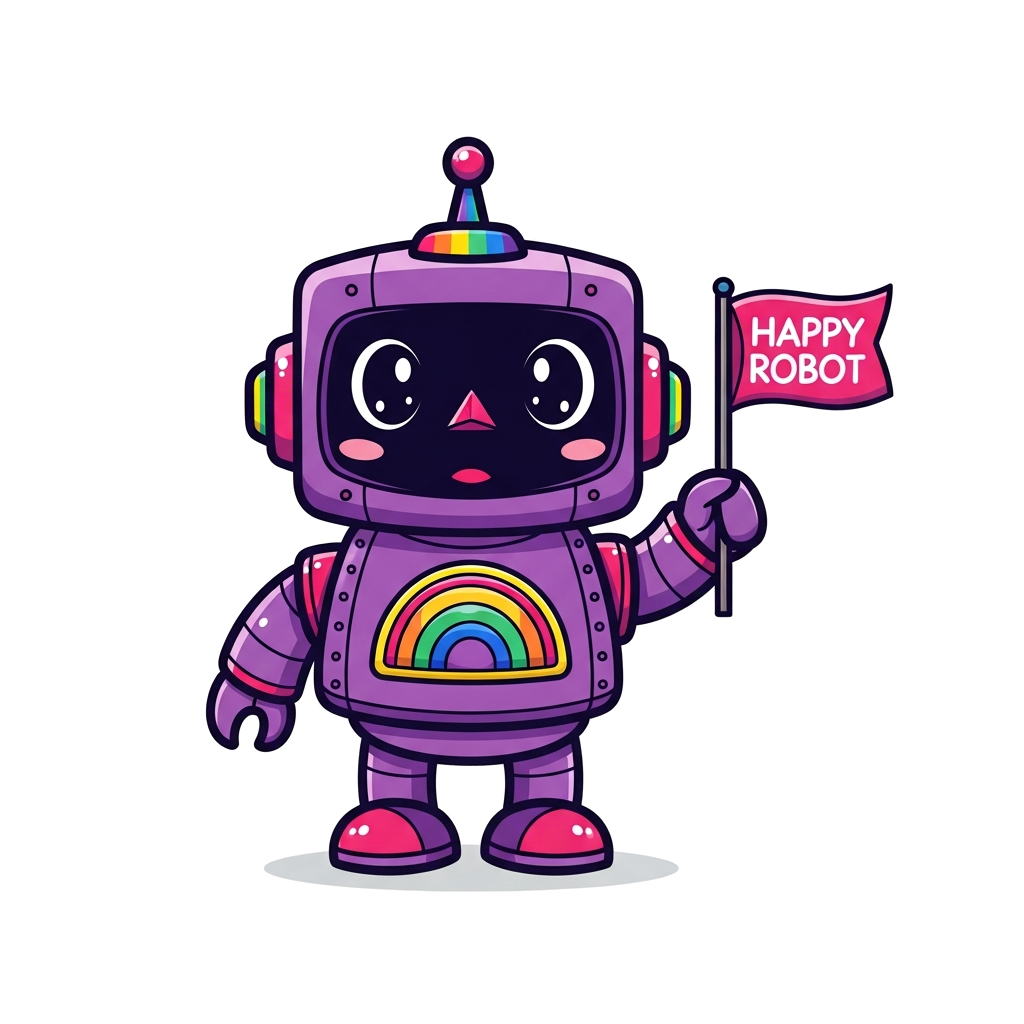 "A super cute, friendly cartoon robot with big eyes, designed in shades of purple and pink, with rainbow accents, holding a small flag that says 'Happy Robot', playful and cheerful style, vibrant colors."