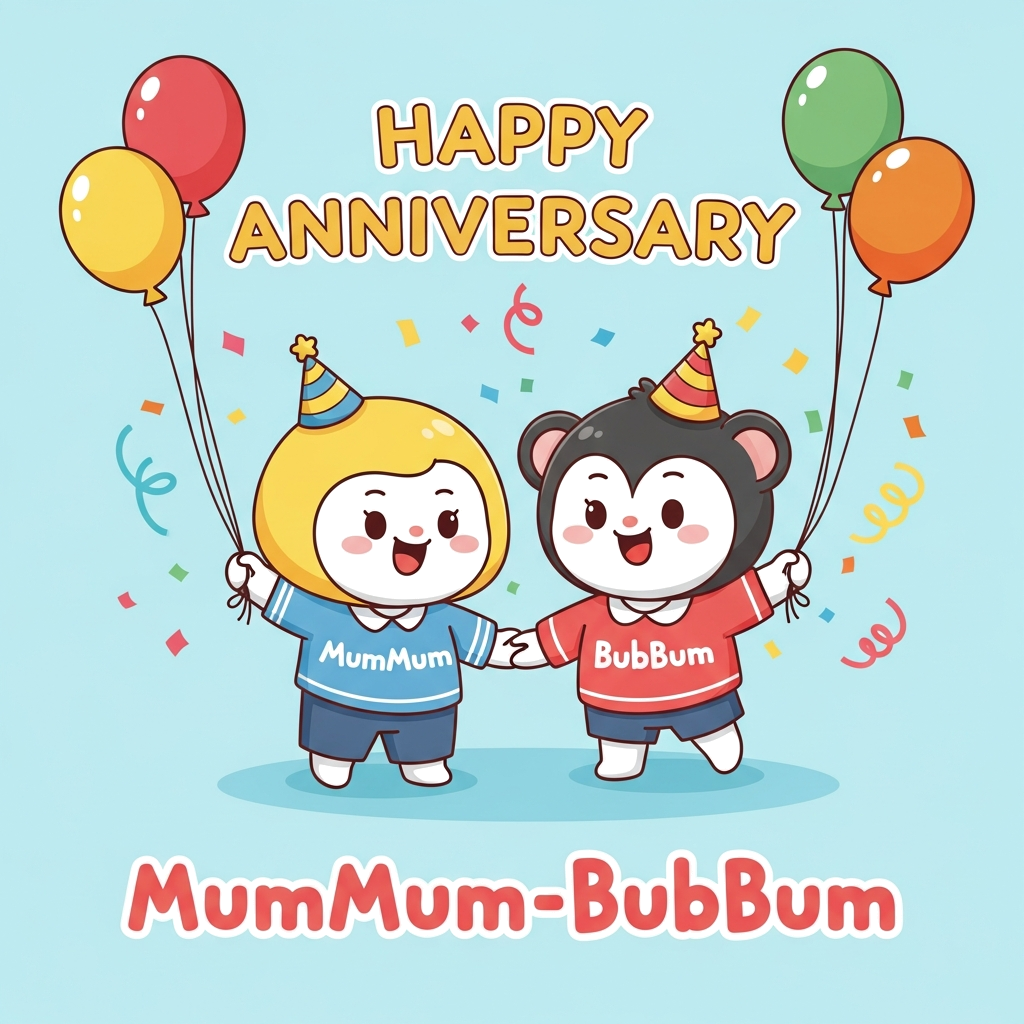 "A dynamic, colorful illustration of 'MumMum' and 'BubBum' cartoon characters happily jumping amidst a shower of confetti and balloons. The text 'Happy Anniversary' is integrated into a festive banner above, and 'MumMum-BubBum' is written below in a whimsical, child-friendly font. The entire design is a seamless, borderless image with a soft, inviting aesthetic."