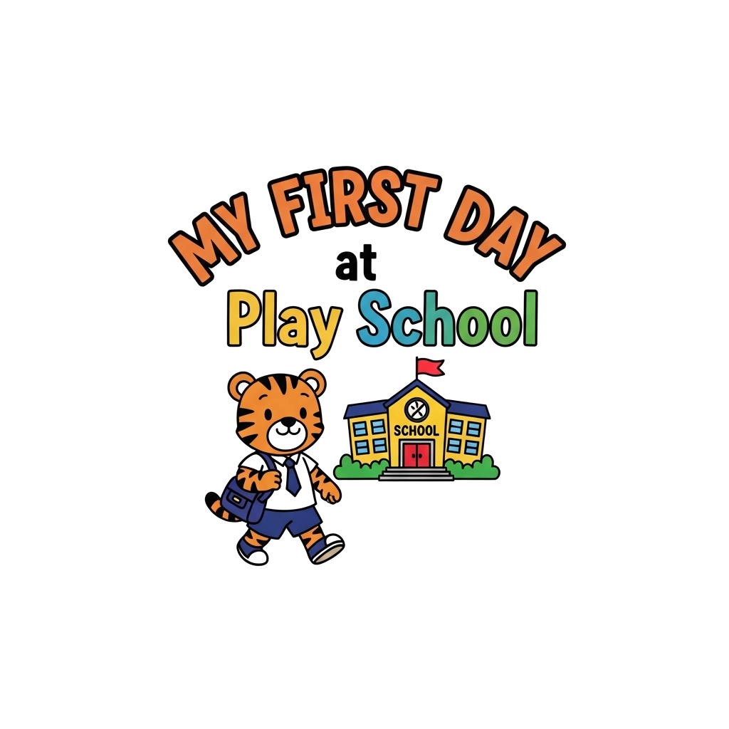 "It should have words "My first day at Play School" in caps. MY FIRST DAY in first line in curved shape and AT PLAY SCHOOL in next line in straight line. It should have image of Tiger dressed in simple school uniform with a school bag going to play school. Play school building also should be there."