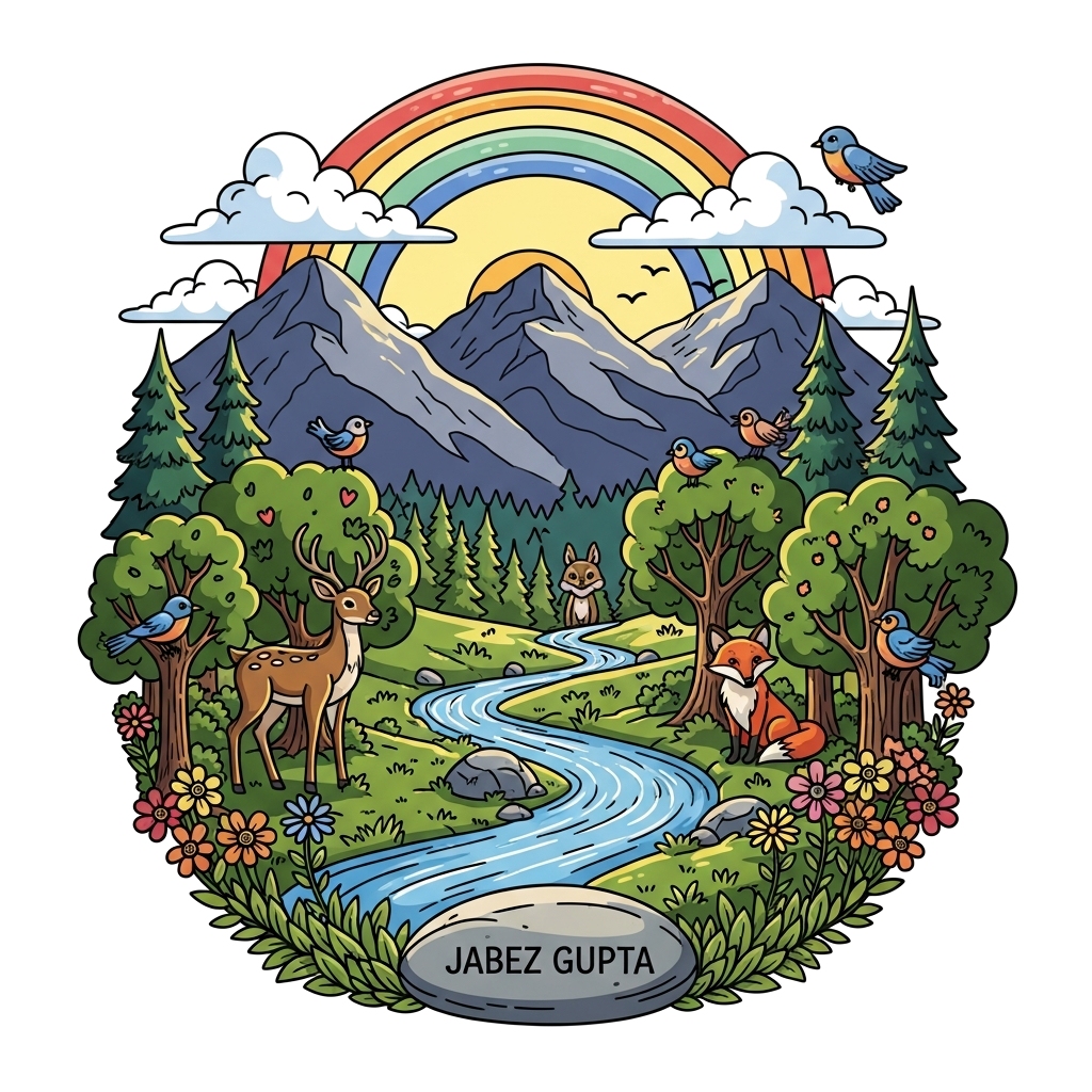 "A whimsical yet detailed illustration of an enchanting forest scene, with tall trees and a sparkling river. A vibrant rainbow stretches across a sky with fluffy clouds and a friendly sun. Adorable, artistically rendered forest animals like a playful otter, a wise owl, and a graceful deer are depicted amidst blooming flowers and lush greenery. The name 'Jabez Gupta' is creatively embedded within the forest's elements, such as on a hidden scroll or carved into a tree."