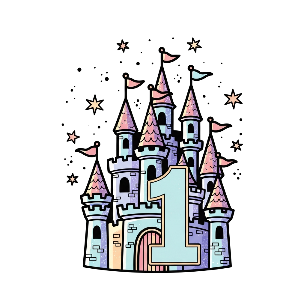 "A whimsical, sparkling princess castle with turrets and flags, surrounded by floating stars and glitter, with a prominent number '1' integrated into the design, in a soft pastel color palette, magical illustration style."