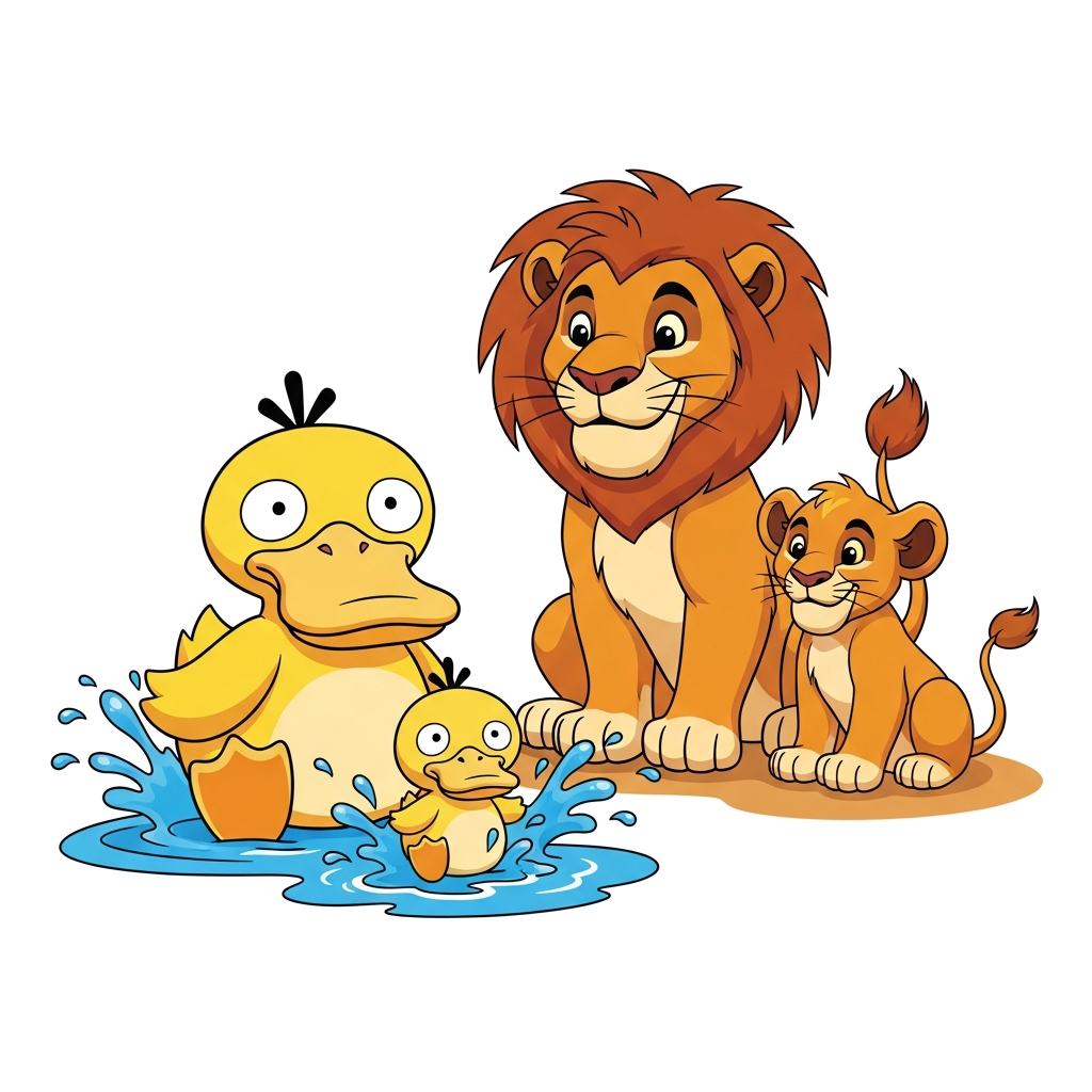 "Psyduck mommy and kid in front , playing in water and a lion sitting on land and observing them along with a male cub"