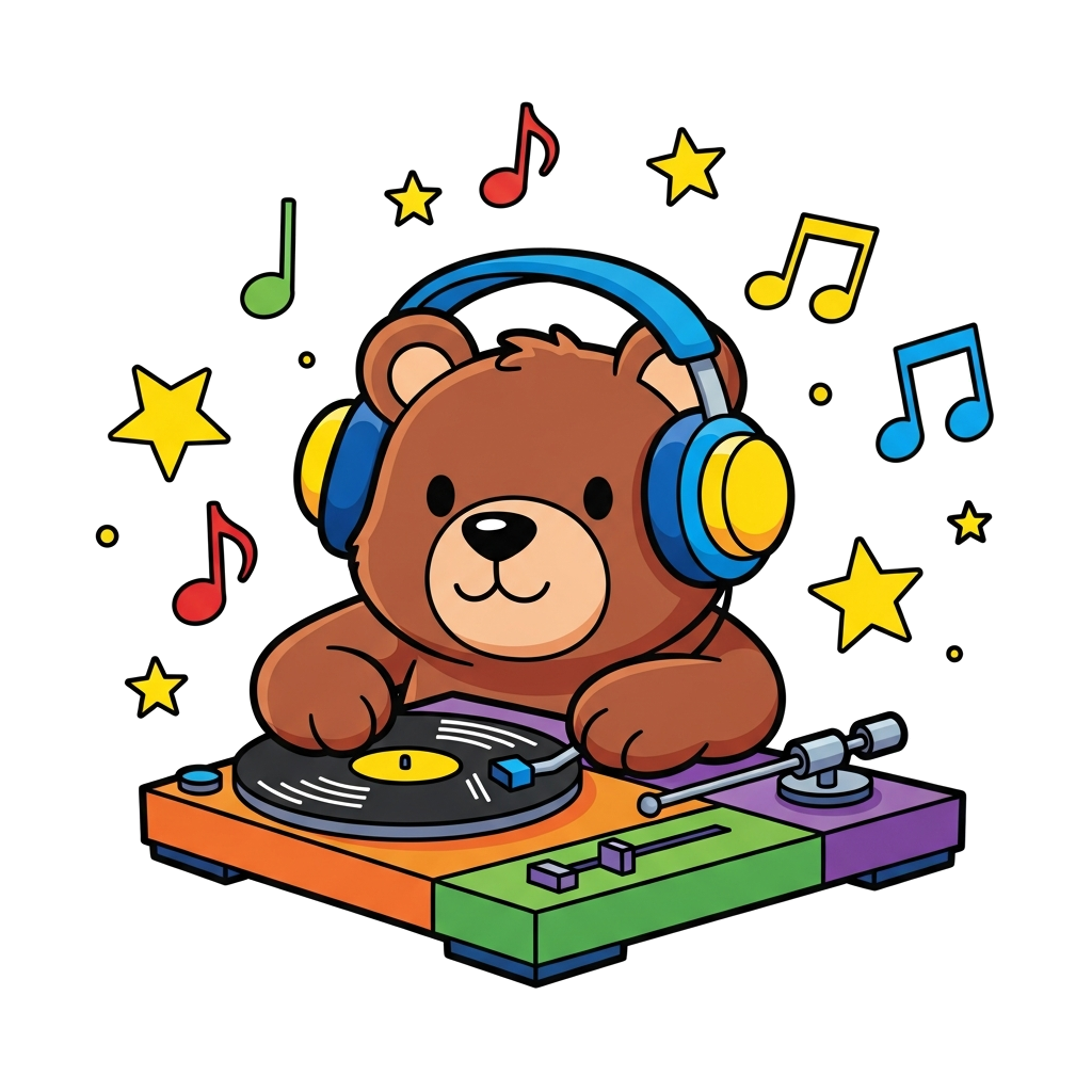 "A cheerful cartoon bear DJ wearing oversized headphones, spinning records on a colorful turntable, surrounded by floating musical notes and stars, vibrant and playful style."