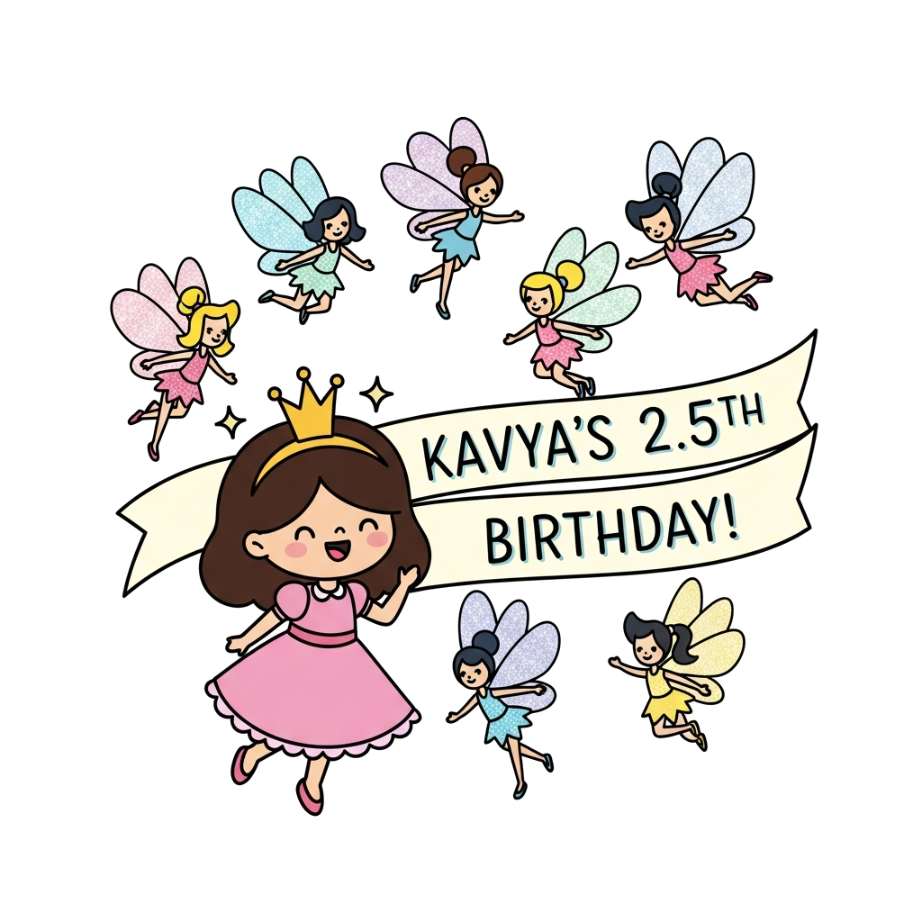 "A cute cartoon princess with a tiny sparkling crown, surrounded by whimsical fairies with glittery wings, all in a vibrant, playful style. A banner subtly integrated into the scene reads 'Kavya's 2.5th Birthday!', with soft pastel colors."