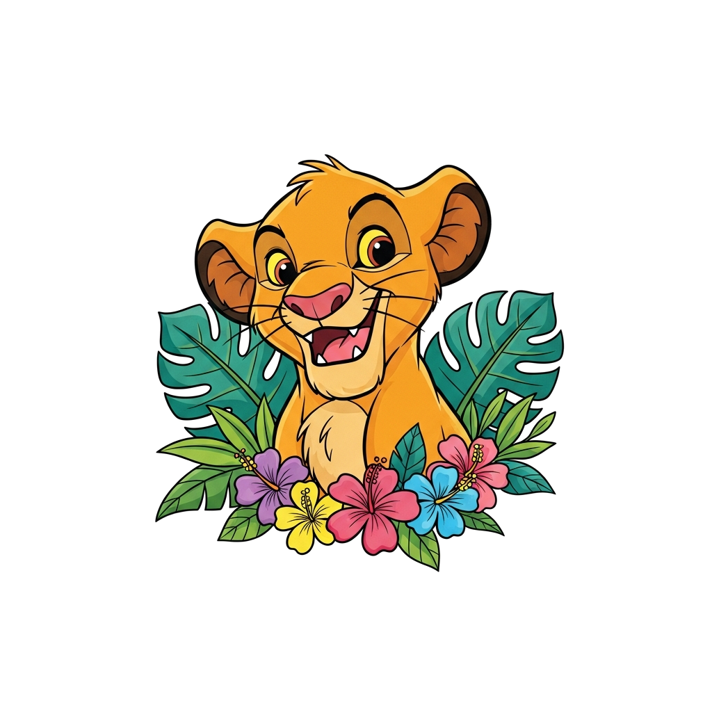 "A cute, playful young Simba cub with a mischievous grin, surrounded by vibrant jungle leaves and colorful, exotic flowers, in a cheerful Disney-inspired cartoon style."