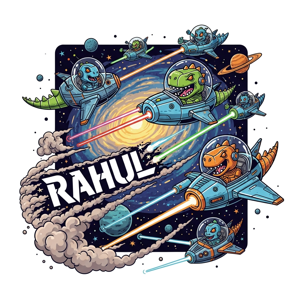 "A dynamic scene with a futuristic spaceship flying past a meteor shower, and a cool, stylized Velociraptor wearing a space helmet peering out, with 'Rahul' incorporated into the ship's design, vibrant and energetic."