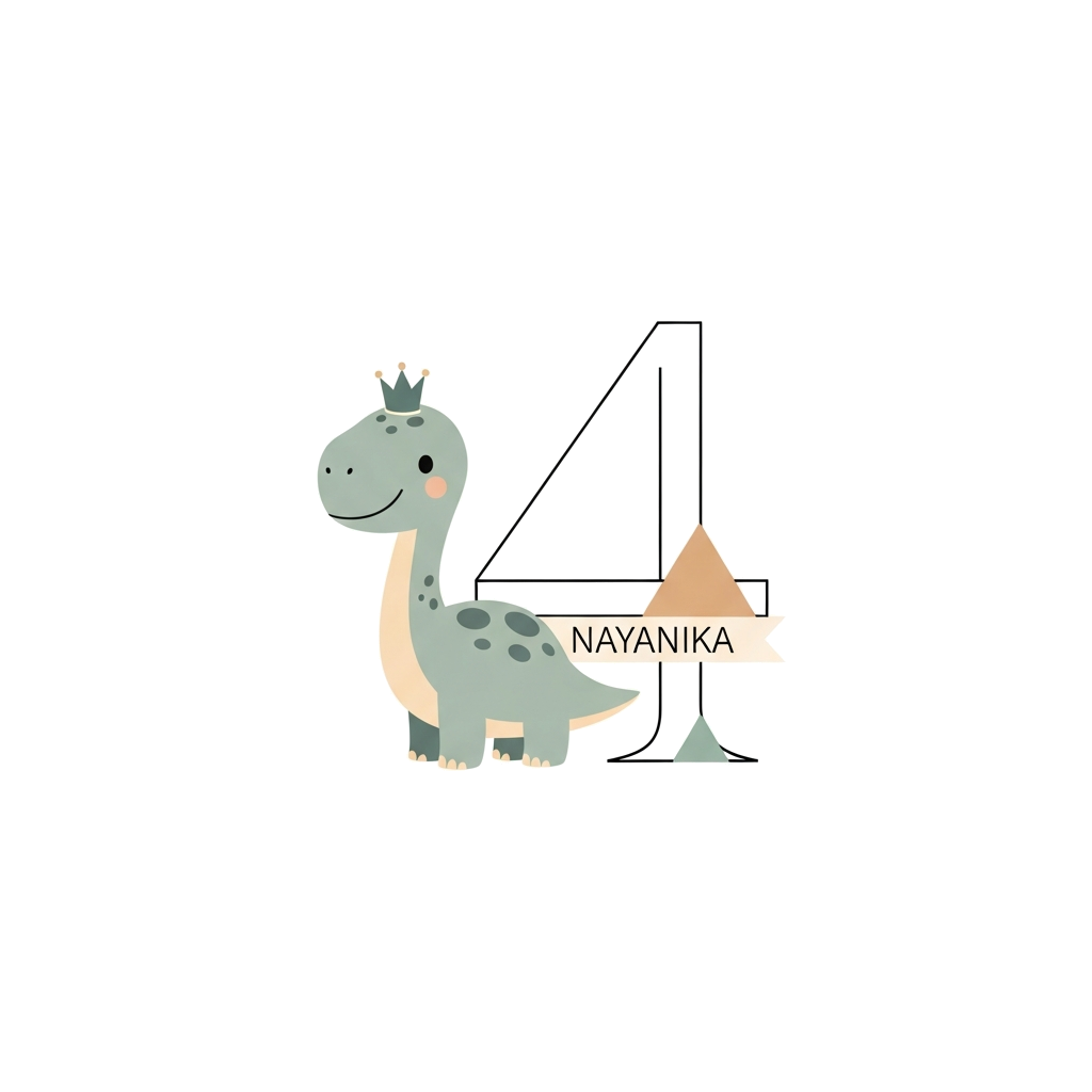 "A minimalist illustration of a friendly, stylized baby Brontosaurus wearing a tiny birthday crown, standing next to a clean, modern number '4'. The name 'Nayanika' is subtly integrated into the design. Soft, muted pastel colors, geometric shapes, vector art style."