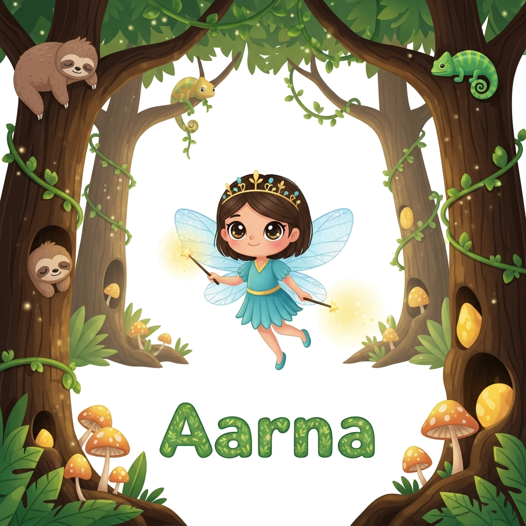 "A charming cartoon fairy princess with big, sparkling eyes, her glittery wings fluttering amongst ancient, glowing jungle trees. She uses her tiny magic wand to illuminate hidden jungle treasures, like sparkling mushrooms and luminous vines. Gentle jungle animals, such as a sleepy sloth and a tiny chameleon, observe her from afar. The name 'Aarna' is written in a cheerful, bubbly font, subtly outlined with glowing jungle patterns."