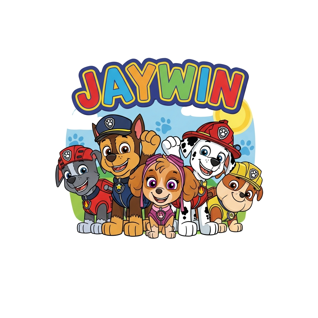 "A cheerful cartoon illustration of the Paw Patrol pups (Chase, Marshall, Skye, Rubble) smiling and waving, with a vibrant, playful banner above them that says 'JAYWIN' in a friendly, bubbly font. The background is a bright, sunny landscape with subtle paw print details."