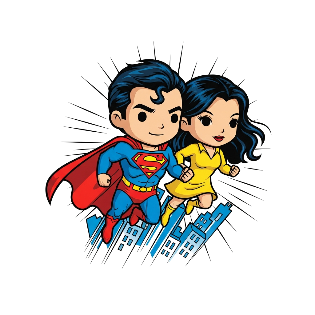 "A vibrant classic comic book illustration of a chibi Superman and a chibi Lois Lane, flying together above a cityscape, in a dynamic pose with bold outlines and bright primary colors, action lines in the background."